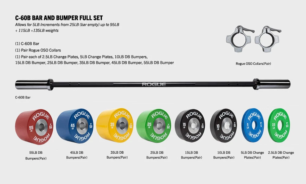 Rogue’s C-60B Bar and Bumper Sets offer a new, space-efficient alternative to the traditional 10-piece fixed barbell sets often found in commercial gyms. Rather than paying for a fleet of fixed bars and a rack to store them on, athletes can quickly access those same standard weight increments while only needing enough storage for one compact specialty barbell and a few of our compatible Rogue Dumbbell Bumpers. Better still, our C-60B sets enable more precise custom weight loads than the usual 10LB fixed bar increments, with smaller change plates available for 5LB adjustments.