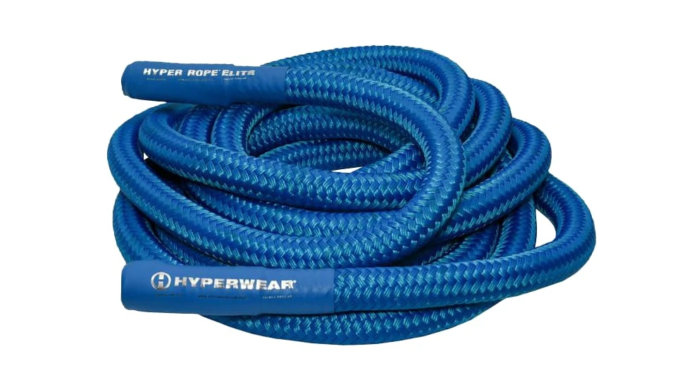 Each 25 ft. long Hyper Rope Elite Battle Rope weighs in at 19 LBS and features a weighted flexible metal core, ultra-durable braided polyester exterior, and easy grip ribbed handles. Compared to the bulk and limitations of a standard 50 ft. anchored conditioning rope, the Hyper Rope is conveniently portable, space-efficient, and dynamic—offering a greater variety of potential movements beyond battle rope wave exercises alone. The premium North American construction also makes the rope easier on floors, quieter and clean; with none of the shedding fibers that come from cheaper Poly Dacron styles.