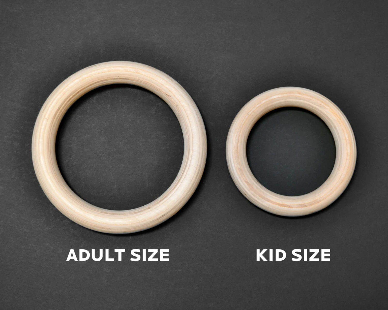 Gymnastics can be one of the best tools for child athletic and personal development. Now, there is an answer to the 1.25″ diameter standard ring set. The Kids’ Wooden Rings have a 1.10″ diameter thickness with a proportionately scaled ring diameter. This allows for the perfect grip and positioning for smaller hands. The components used for the Rogue Kids’ Rings are manufactured and assembled with our usual highest standard in mind. Assuring that, both, the young athletes and their rings will continue to thrive under pressure.