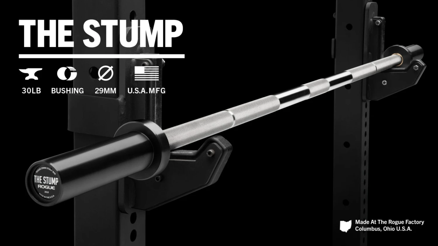 The Rogue Stump Bar is a rackable, short-sleeve version of our stainless steel Ohio Power Bar, built with the same 29mm diameter, little-to-no flex shaft (200,000 PSI), bronze bushings, and aggressive knurl pattern (in single powerlifting knurl marks + center knurl). Though the shorter sleeve length (7.3125” vs 16.25”) reduces its potential weight loads, the 30 LB Stump Bar is ideal for home gym owners who train in tight quarters and/or don’t need full-length sleeves for their powerlifting movements. With thinner plates such as our USA Olympic Plates or Calibrated LB Steel Plates the Stump can still be loaded to over 500LBs.