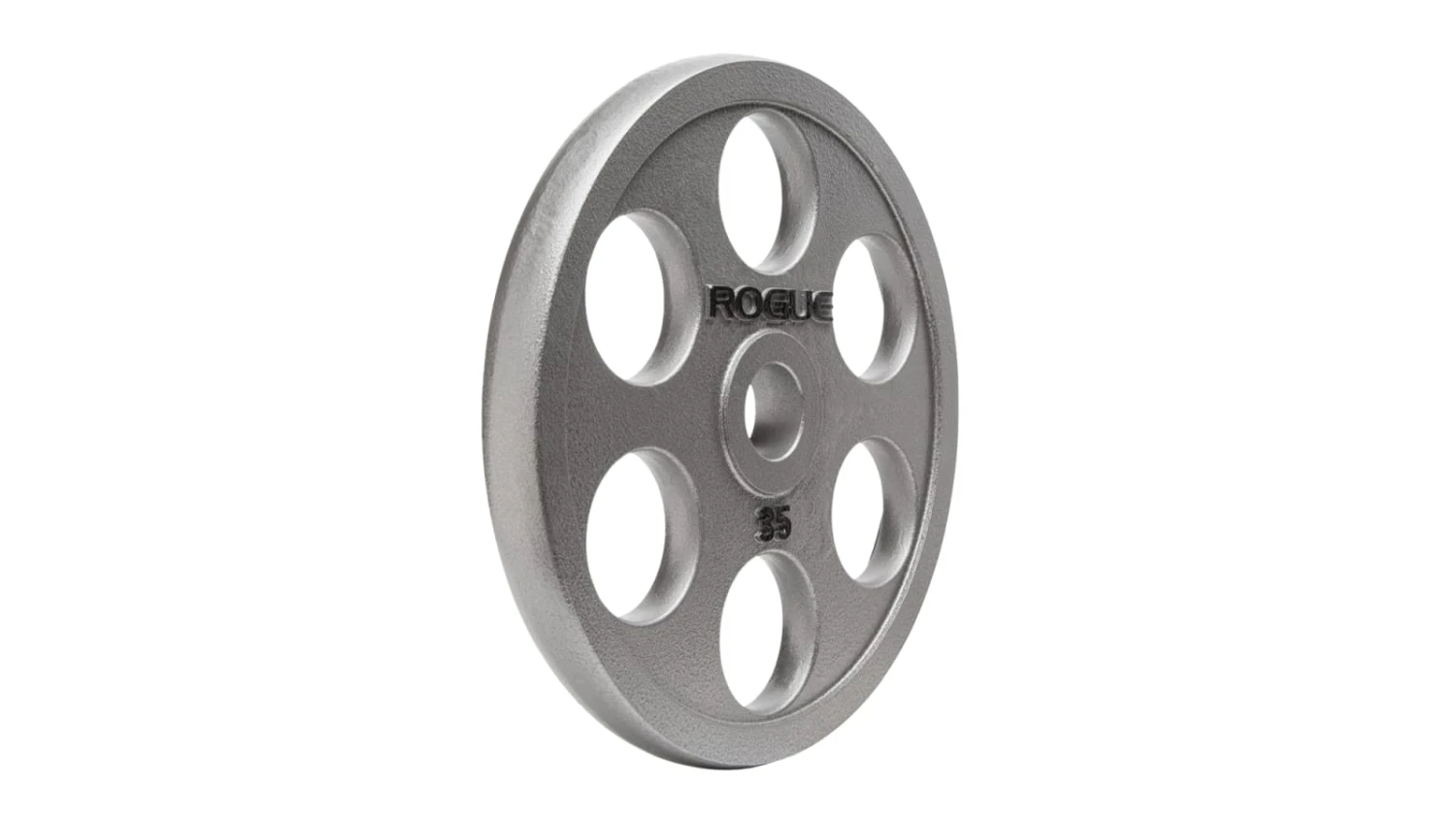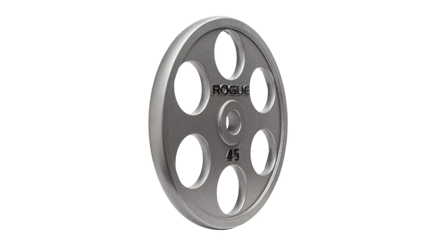 Our Rogue 6-Shooter Grip Plates feature a unique gray hammertone finish, black text, and six symmetrical grip holes spaced out around the circumference of each 25LB, 35LB, and 45LB plate (a Urethane Coated 6-Shooter is also available). The holes are precision-cut and in close proximity to the raised lip at the edge of each plate, offering athletes a comfortable grip and an easier way to lift, carry, or load a plate from any angle.