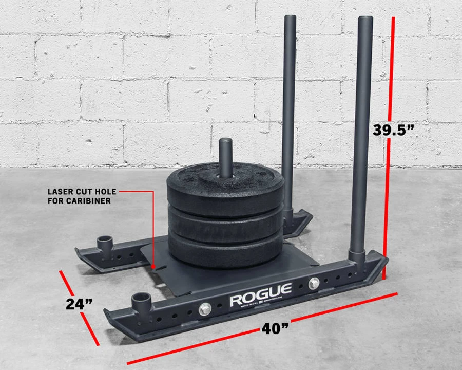 The CrossFit Games battled-tested Rogue Dog Sled comes standard with a quarter-inch steel base plate, 2×3” 11-gauge steel tubing, and a pair of 3-foot upright push bars designed to accommodate both high and low push stances. Compared to many prowler and speed sled designs, the portable Dog Sled has a smaller overall surface area, allowing you to get the most out of the plates that you own.