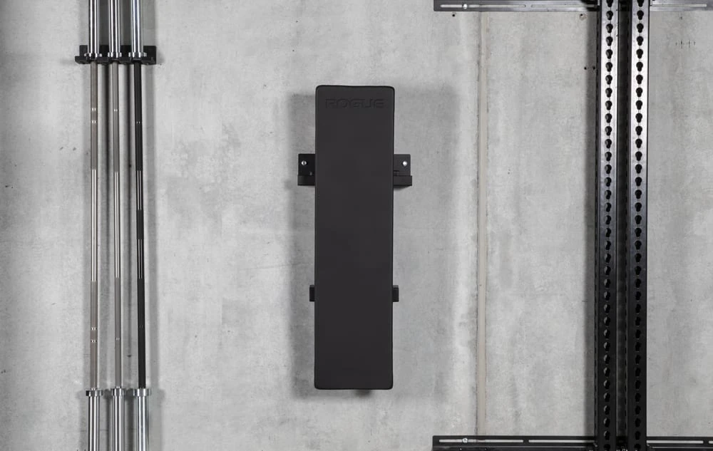 The Rogue Fold-Up Utility Bench introduces a new hinged leg + detent pin design that makes the unit uniquely collapsible for improved space efficiency. A custom, wall-mounted steel Bench Hanger is also included standard (along with 3/8″ x 2-1/2″ lag bolts), enabling athletes to store the Utility Bench securely on a gym wall when not in use.