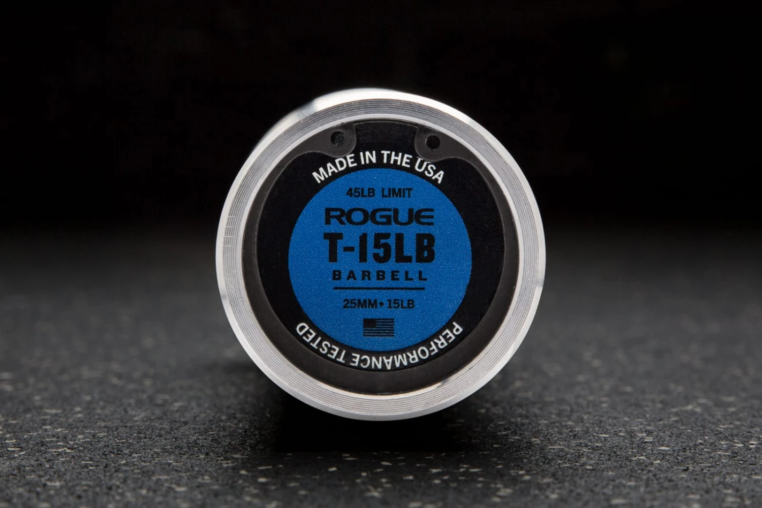Fully machined and assembled at the Rogue factory in Columbus, Ohio, the T-15LB Technique Bar features a 28MM bare aluminum shaft with dual Powerlifting and Olympic knurl marks. With this design, we’ve also spaced the collars at the same distance as an IWF standard competition bar, giving athletes the ability to maintain proper grip position as they progress from a light bar to a Men’s or Women’s weightlifting bar.