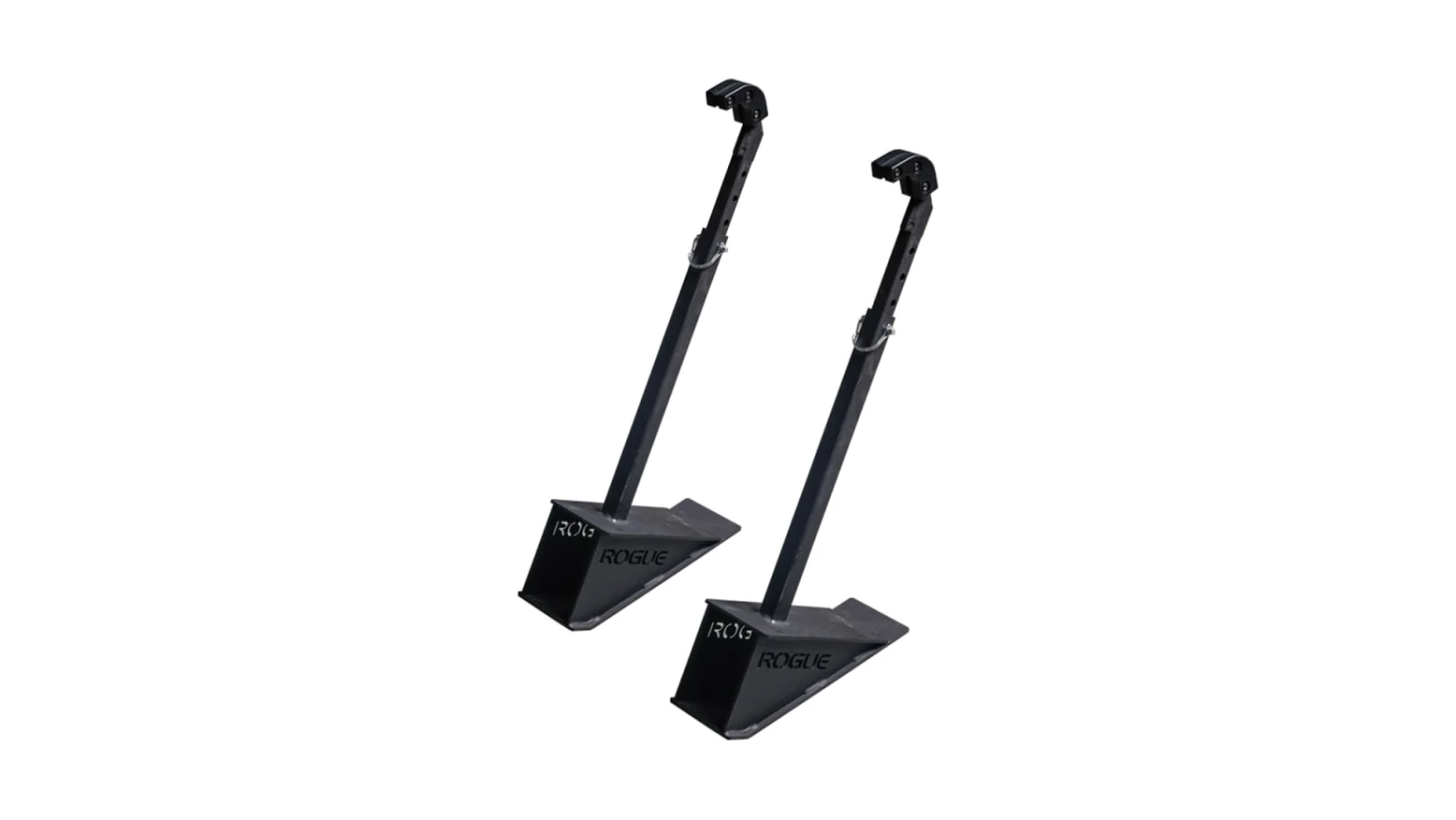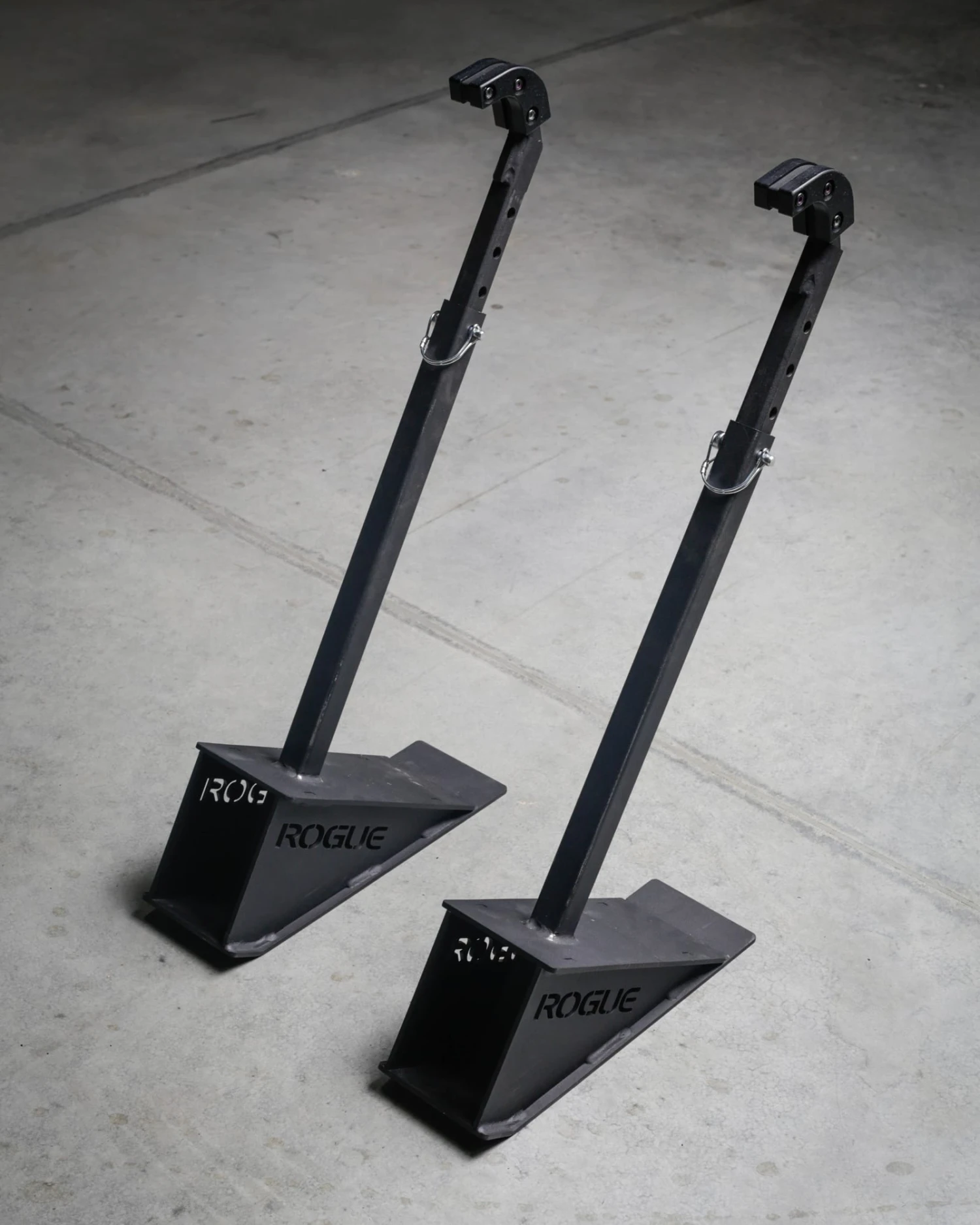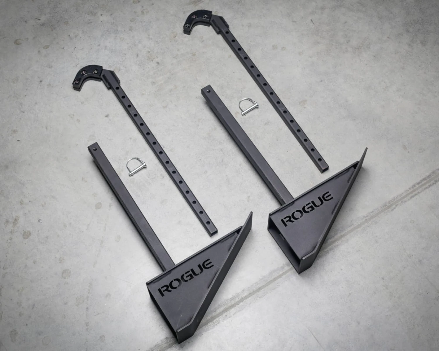 Developed in partnership with Mark Bell of Super Training Gym, Rogue Weight Releasers offer a new take on a powerlifting classic. These heavy-duty, fully-adjustable steel hook attachments are designed to preload/overload the eccentric portion of a lift, creating greater explosiveness on the concentric end. The base portion of each unit can be loaded with standard Olympic plates, then set at one of 15 height positions using the telescoping, lock-in pin system (Adjustable from 28.75″ – 49.75″ overall). This means you can quickly adjust the Weight Releasers for both squatting and benching use, and for athletes of any size.
